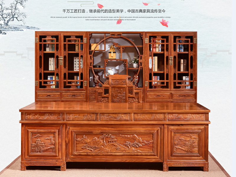 2.4-2.6-2.8山水辦公桌+山水寶座+明式三組合書柜